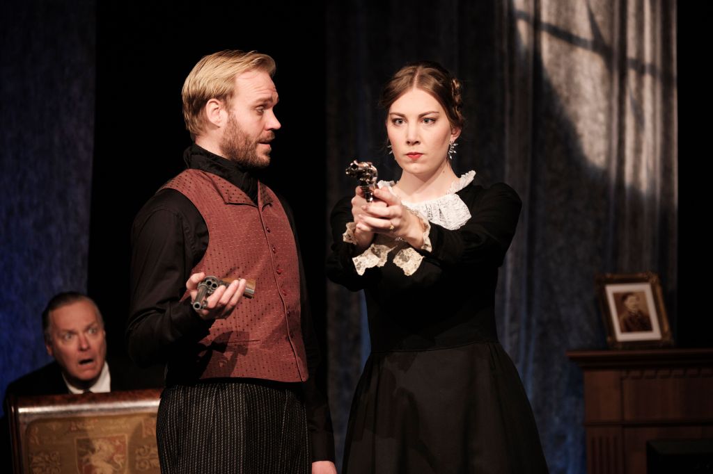 Ola Hörling betonar det fjäderlätta i stycket och de tre sångarna följer villigt hans regi med välvårdade röster och en stor portion elegans i agerandet. Lovisa Huledal gestaltar den unga änkan Popova med vacker mezzo och uttrycksfull gestik. Karl Petter Eriksson Lindblads Smirnov är burdus, illmarig, sjungen med en omfångsrik baryton och Anders Nyström använder sin bas att skapa den klassiska betjänten som har fingrarna i alla syltburkar. Det blir en salongskomedi utan seriösa undertoner eller ambitioner att förbättra världen och uppfostra publiken.