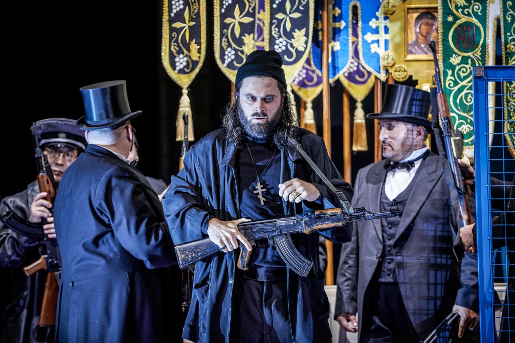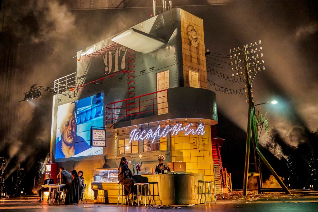Scenografin är fantastisk. Det är Ryssland sett med västerländska glasögon: trassliga telefontrådar neonskyltar med kyrillisk text, storvulna husfasader. Kostymerna följer samma linje: kvinnor i smaklösa guldlamékreationer, män i grovhuggna vardagskläder.