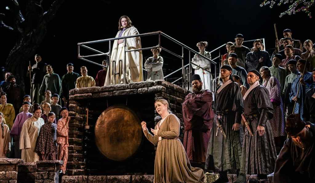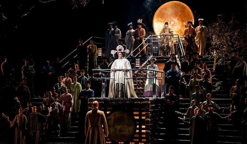 Där sparar Sofia Jupithers uppsättning inte på krutet: en magnifik, nästan överlastad scenografi dominerad av en gigantisk trappa, blommande körsbärsträd, lampor och lyktor samt som grädde på moset ett stilla snöfall. Kostymerna visar upp mängder av stilar och material från glänsande siden till muggiga lumpor, maskerna välgjorda och varierade och ljussättningen spännande och effektiv. Det hela är en ren fröjd för ögat – och exotiskt så det förslår.